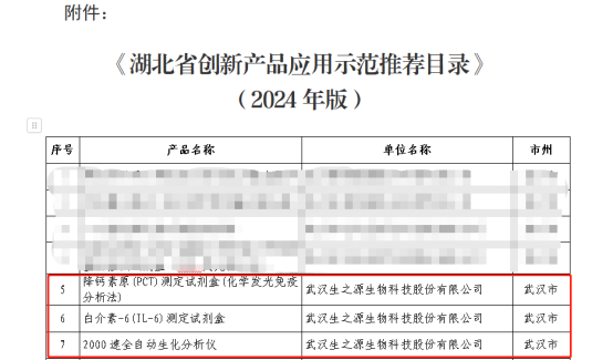 根據(jù)《湖北省創(chuàng)新產(chǎn)品應(yīng)用示范實(shí)施方案》,列入目錄的創(chuàng)新產(chǎn)品,可直接列入《 湖北省節(jié)能環(huán)保技術(shù) (產(chǎn)品)推薦目錄》,積極推薦進(jìn)入 《 國家基本醫(yī)療保險(xiǎn)、工傷保險(xiǎn)和生育保險(xiǎn)藥品目錄》備選名單,優(yōu)先推薦列入國家《首臺(tái)(套)重大技術(shù)裝備推廣應(yīng)用指導(dǎo)目錄》等。武漢生之源生物有3個(gè)產(chǎn)品入選,分別是降鈣素原(PCT)測(cè)定試劑盒、白介素6(IL-6)測(cè)定試劑盒、全自動(dòng)生化免疫分析儀(SZY-BA2000)。
